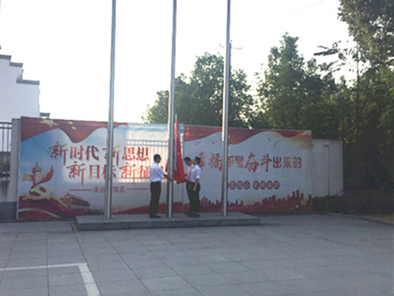 朝陽初起,金秋送爽。公司大樓前彩旗獵獵,“新時代、新思想、新目標、新征程”、“幸福都是奮斗出來的”巨幅宣傳展版,格外醒目,將現(xiàn)場氣氛烘托得熱烈、盎然。7時30分,伴隨著出旗音樂,旗手柯淼、護旗手倪莊翔、宋郭楠在旗臺處肅立以待。全體金信人著裝一致,將小國旗靠在胸前,手持《員工手冊》,行注目禮,在嘹亮雄壯的《義勇軍進行曲》中,鮮艷的五星紅旗冉冉升起,高高飄揚在廣場上空。