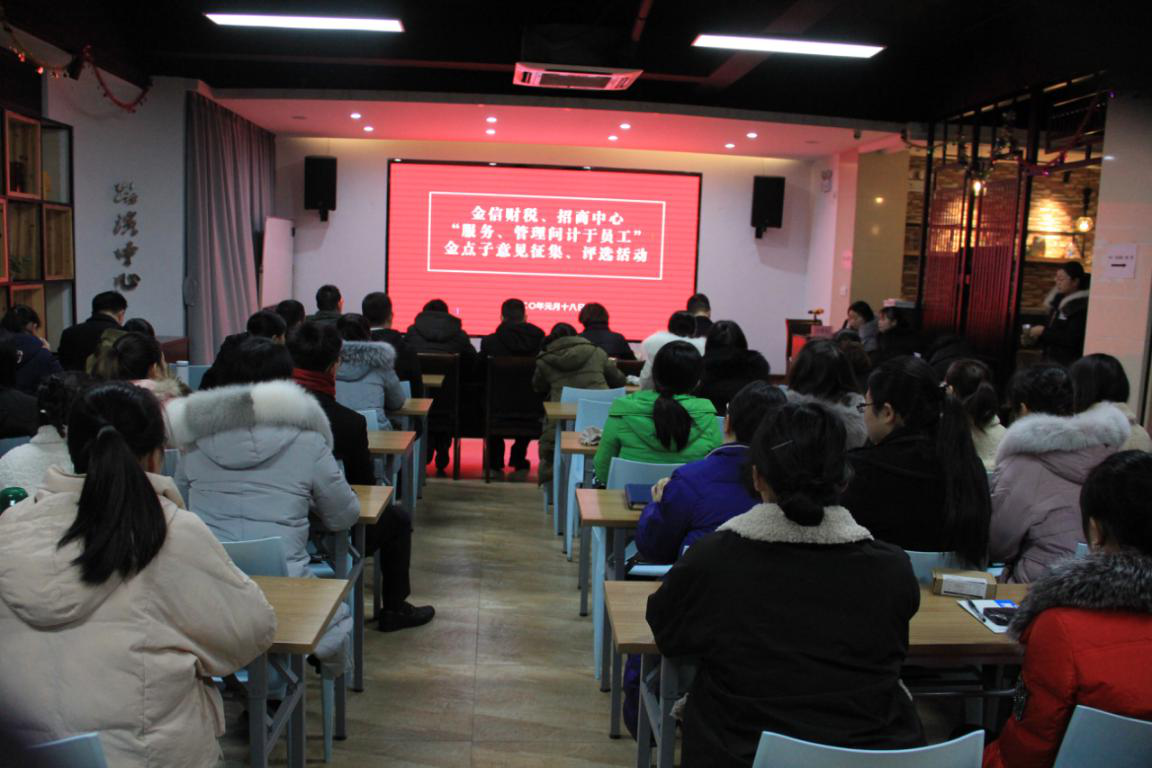 1月18日,招商中心、金信財稅召開“金點子”評選大會,并專門聘請縣經濟開發區副主任潘利青、縣投資促進局副局長鮑杜萍、縣科技商務經濟信息化局副局長胡志堅等三位領導作為評委參與評選,金信財稅全體員工50余人參加了大會。