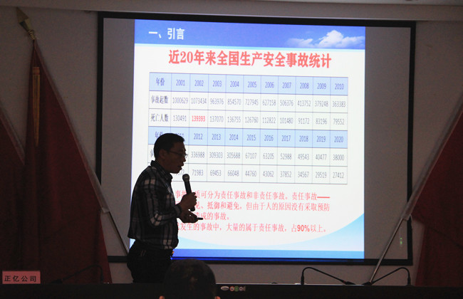 最后,正億公司注冊(cè)安全工程師吳智勇對(duì)參會(huì)人員進(jìn)行了專題的安全生產(chǎn)知識(shí)培訓(xùn)。培訓(xùn)內(nèi)容包括企業(yè)主要負(fù)責(zé)人的法定職責(zé)、安全生產(chǎn)管理機(jī)構(gòu)與人員設(shè)置、日常安全生產(chǎn)管理重點(diǎn)等,并觀看事故案例視頻,為企業(yè)加強(qiáng)安全管理打下堅(jiān)實(shí)基礎(chǔ)。