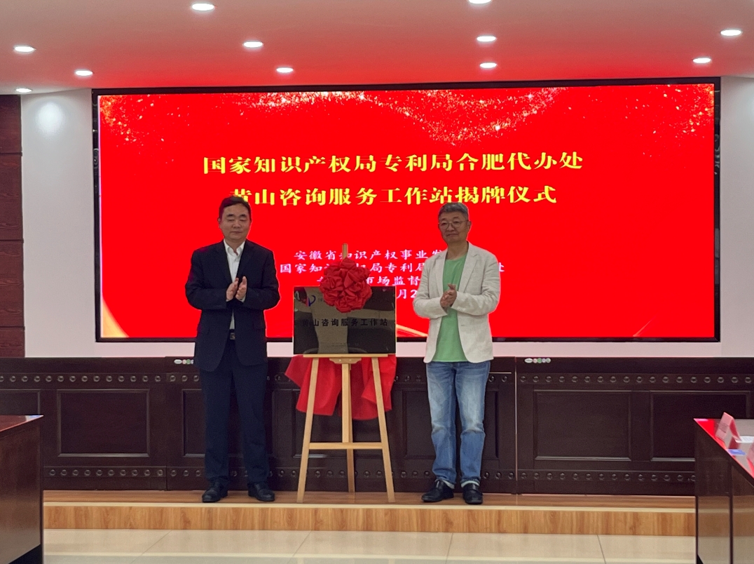 揭牌儀式上,孫雄軍宣讀省知識(shí)產(chǎn)權(quán)事業(yè)發(fā)展中心《關(guān)于同意設(shè)立國(guó)家知識(shí)產(chǎn)權(quán)局專利局合肥代辦處黃山咨詢服務(wù)工作站的批復(fù)》皖知中[2025]9號(hào),丁濤主任宣布黃山咨詢服務(wù)工作站開通辦理業(yè)務(wù)。最后,出席活動(dòng)的丁濤主任和黃劍局長(zhǎng)共同揭開國(guó)家知識(shí)產(chǎn)權(quán)局專利局合肥代辦處黃山咨詢服務(wù)工作站站牌,標(biāo)志著國(guó)家知識(shí)產(chǎn)權(quán)局專利局合肥代辦處黃山咨詢服務(wù)工作站正式運(yùn)營(yíng)。